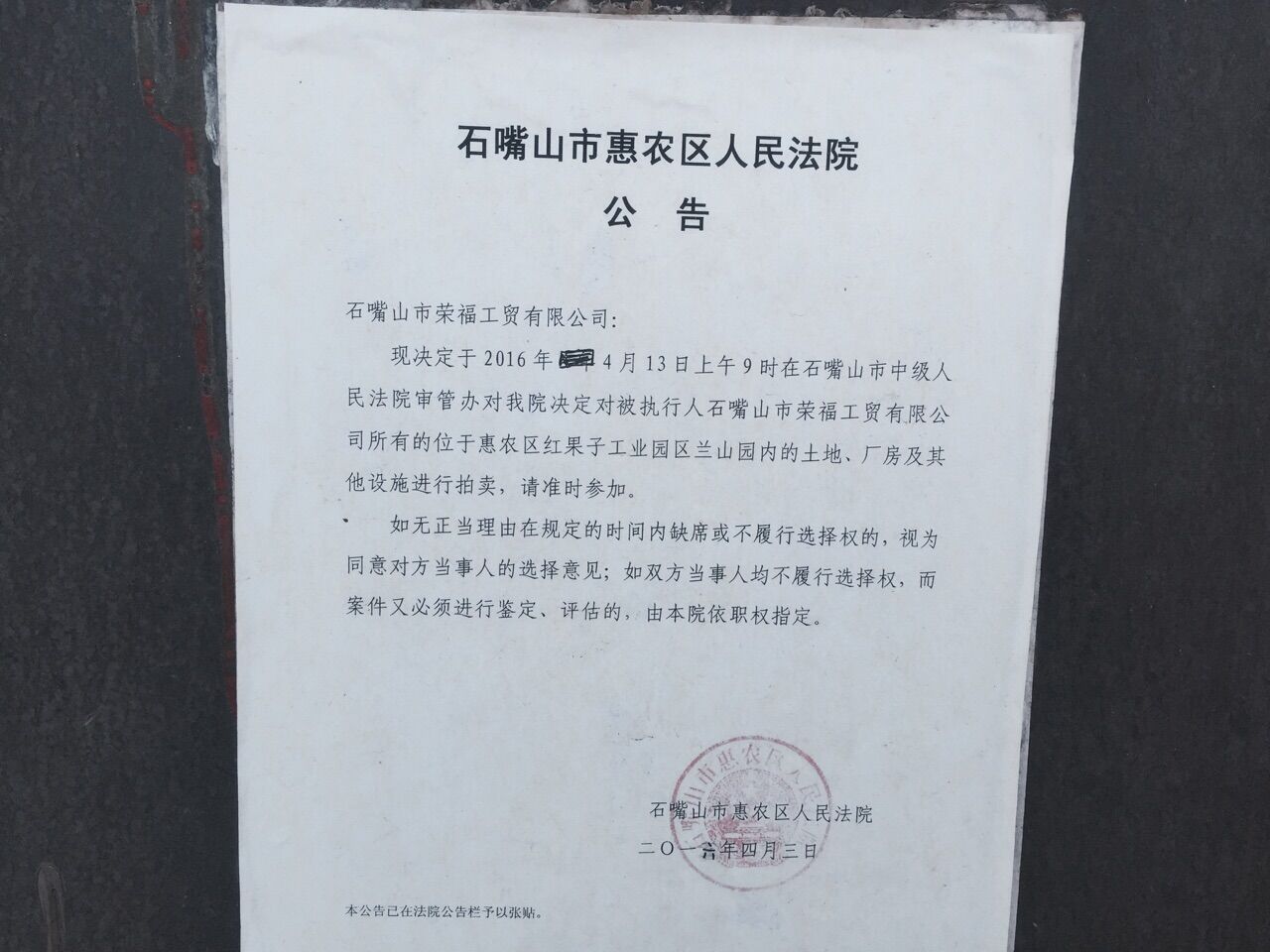 受石嘴山市惠農(nóng)區(qū)人民法院的委托,本公司定于2016年5月19日(星期四)15時舉行拍賣會對位于惠農(nóng)區(qū)紅果子鎮(zhèn)蘭山園內(nèi)的土地及地上建筑物、院內(nèi)設(shè)備進(jìn)行公開拍賣。